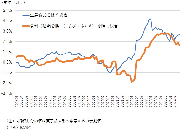 昨年には一時2桁近い前年比上昇率を示していた生鮮食品を除く食料品価格も、7月には同+2.6%まで低下し、CPIの上昇率を主導する役割を既に終えている。