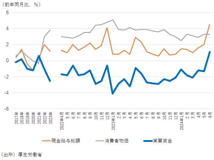 現金給与総額は前年同月比+4.5%と5月の同+2.0%から大きく上昇したが、残業代やボーナスなどを除いた基調的な給与である所定内賃金は前年同月比+2.3%と、消費者物価(持ち家の帰属家賃を除く総合)の同+3.3%をなお大きく下回っている。
