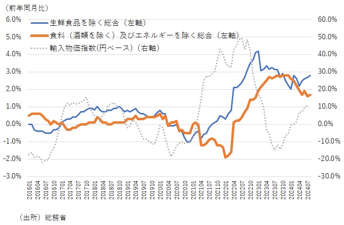 円安修正の結果、今後物価上昇率はやや下振れていくと見込まれる。コアCPI(消費者物価上昇率・除く生鮮食品)は、8月に前年同月比+2.8%と物価目標の2%を大きく超えているが、コアコアCPI(食料(除く酒類)・エネルギーを除く基調的な消費者物価)の上昇率は+1.7%と1%台まで低下している(図表1)。