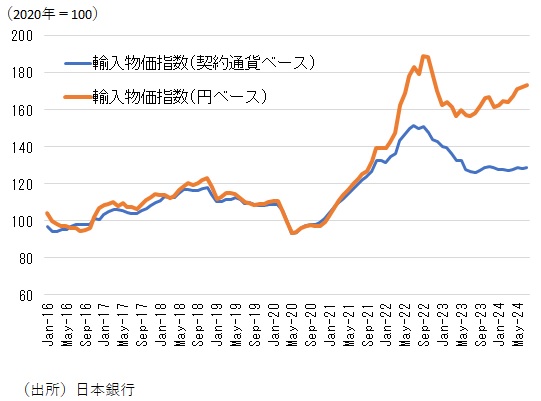コアCPIや基調的な消費者物価上昇率の上振れは、輸入物価上昇による一時的な側面が強いが、輸入物価の上昇も海外での食料・エネルギー価格の上昇ではなく、足もとではほぼ円安の影響によるものだ(図表2)。足もとの円高が続けば、輸入物価は低下に転じ、コアCPIの上昇率やコアコアCPIの上昇率は下振れていくだろう。その結果、2%の物価目標達成も遠のいていくと予想される。