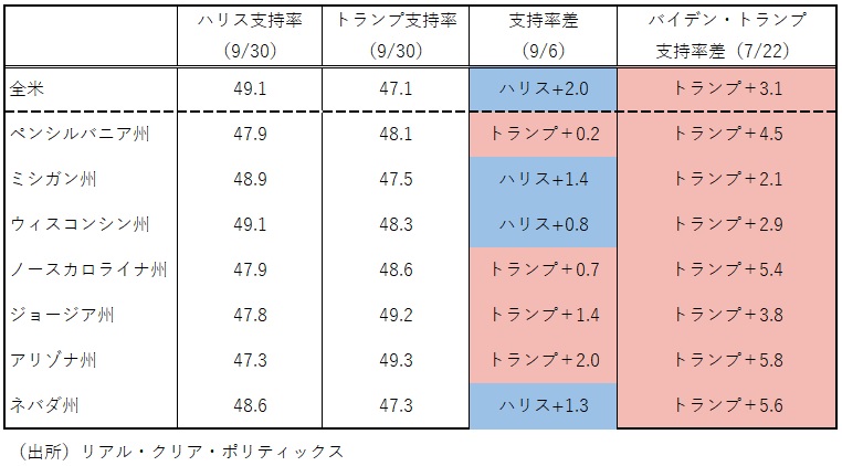 全米の世論調査を見ると、ハリス氏はトランプ氏をほぼ一貫して上回っている。しかし両者の差は決して大きくない。さらに、勝敗の鍵を握る激戦7州では、両者の支持率は拮抗している。激戦7州の中でも、選挙人数が多く特に重要なラストベルト3州(ペンシルベニア州、ミシガン州、ウィスコンシン州)では総じてハリス氏がやや有利であることを踏まえると、全体的にはハリス氏が若干有利と言えるかもしれないが、それでも最終的な勝敗はまだ見えていない(図表)。