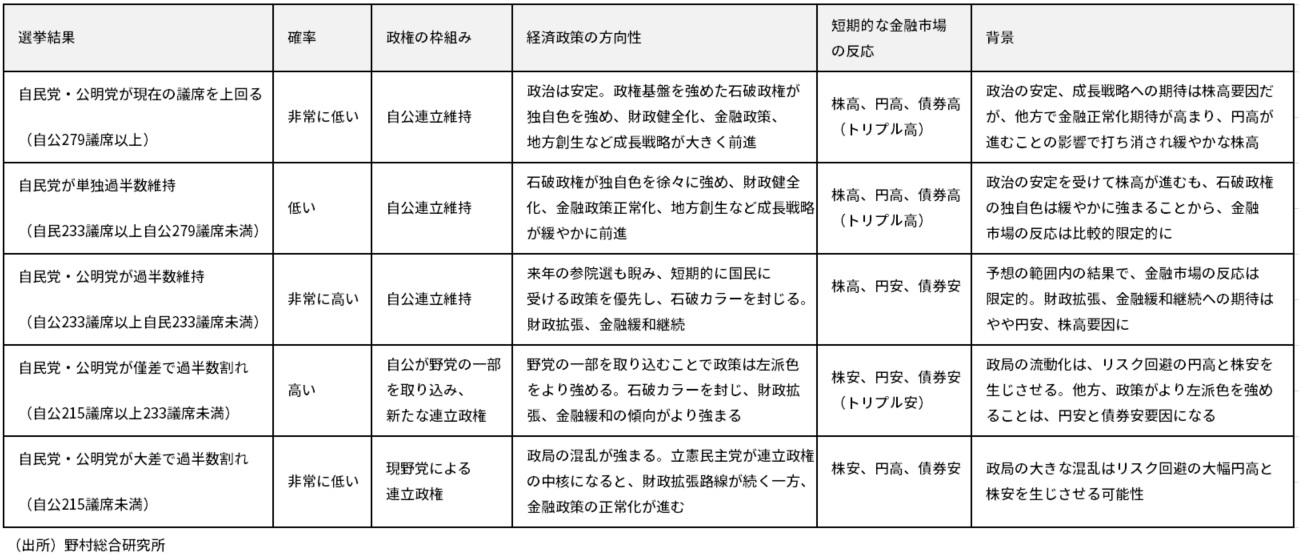 自民党・公明党が僅差で過半数割れとなる場合には、追加公認あるいは国民民主党など一部の野党を連立与党に取り込むことが予想される。その場合、経済政策はより左派色を強める。また、「石破カラー」はより強く封じ込められ、金融政策正常化や財政健全化はさらに後退する。