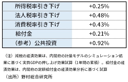 他方、減税の場合には、法人税率引き下げ、消費税率引き下げ、所得税率引き下げの順番に景気浮揚効果は高く、それぞれ1年間の実質GDPを0.48%、0.43%、0.25%押し上げると試算される(図表)。