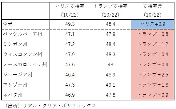 11月5日の米大統領選挙が近づく中、民主党大統領候補のハリス氏に失速感が広がっている。10月22日時点の最新調査結果(リアル・クリア・ポリティックス集計)によると、全米の平均支持率ではハリス氏は共和党候補のトランプ氏を0.9%ポイントと僅差で上回っているが、勝敗を大きく左右する激戦7州では、すべての州でハリス氏の支持率はトランプ氏を下回っている(図表)。最近までは激戦7州では両氏の支持率は比較的拮抗していたが、足もとではハリス氏の支持率が急速に低下しているのである。
