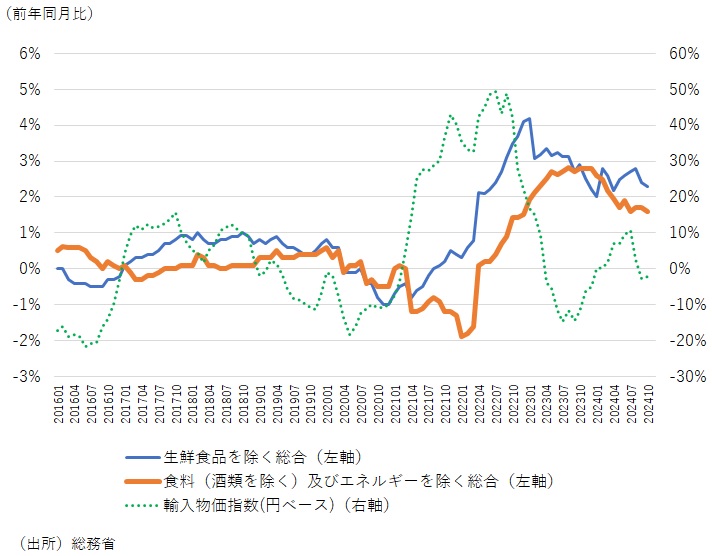 日本銀行は、輸入物価上昇による物価押し上げ効果は減衰している一方、賃金上昇がサービス価格に転嫁されることで、基調的なインフレ率は高まっていき、2%の物価目標が達成されると説明している。