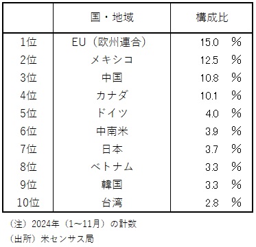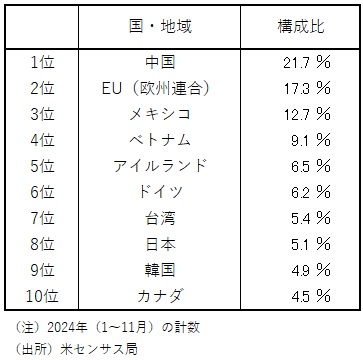 2024年の貿易統計で、米国の貿易赤字額(財)のうち、国別で見て最大なのが中国である。その比率は21.7%(1~11月の累計)で、2番目に大きいメキシコの12.7%を大きく上回っている。欧州連合(EU)の17.3%も上回っている(図表1)。また輸入額に占める中国の比率は10.8%と、国別に見ればメキシコに次いで第2位の規模である(図表2)。