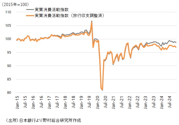 日本銀行が発表する実質消費活動指数でインバウンド需要の影響を除く旅行収支調整済の系列を見ると、2024年10-12月期は前期比-0.5%と7-9月期の同+0.7%から減少に転じ、さらに最新12月の水準は10-12月平均比で-0.1%と2025年1-3月期GDPに対してマイナスの下駄を履いている状況だ。