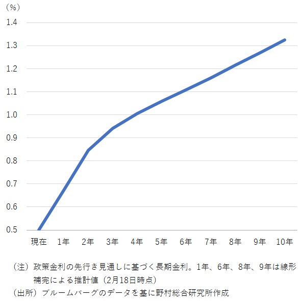 金融市場での政策金利の先行きの見通しに基づいて計算されるスワップレート、円OISスワップレートを見ると、2月18時点で10年利回りは1.3%台と、現物の国債利回りに近い水準となっている(図表)。長期の利回りは、短期の政策金利の見通しの平均値で決まるが、円OISスワップレートには、政策金利が来年1%まで引き上げられるとの期待が織り込まれているように見える。
