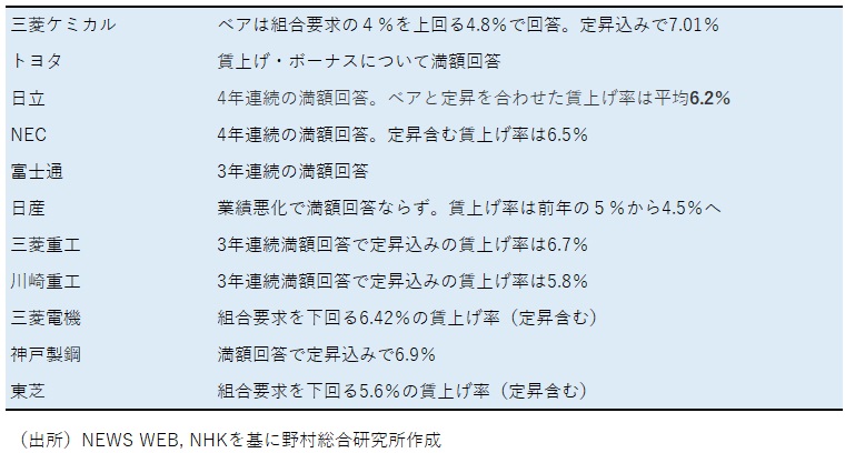 今年の春闘は3月12日に集中回答日を迎えた。自動車や電機などでは昨年同様に満額回答が相次ぎ、高水準での賃上げ回答が多く見られた(図表1)。