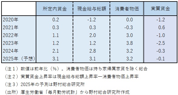 集中回答日の結果を受けて、高い賃上げ率が定着しつつあるという前向きの評価も多くなされるだろう。しかし実際には、高い物価上昇率を賃上げが後追いしている状況が続いている(コラム「3月12日に集中回答日を迎える2025年春闘:賃上げ率は高水準ながらも加速感を欠き、消費の追い風には力不足」、2025年3月7日、「春闘後も実質賃金の本格回復は見込めず:実質賃金上昇率は当面小幅下落が続くか(1月毎月勤労統計)」、2025年3月10日)。
