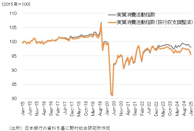 しかし実際には、国内経済も決して楽観できる状況にはない。第1に、生鮮野菜やコメの価格高騰の影響などから、個人消費の下振れ傾向がより顕著になっている。日本銀行が発表している実質消費活動指数(旅行収支調整済)は、昨年12月に前月比-0.7%、今年1月に同-1.3%と大きく下振れ、年末以降の個人消費はほぼ失速状態にある(図表2)。これは、日本銀行に追加利上げを慎重にさせる要因だ。