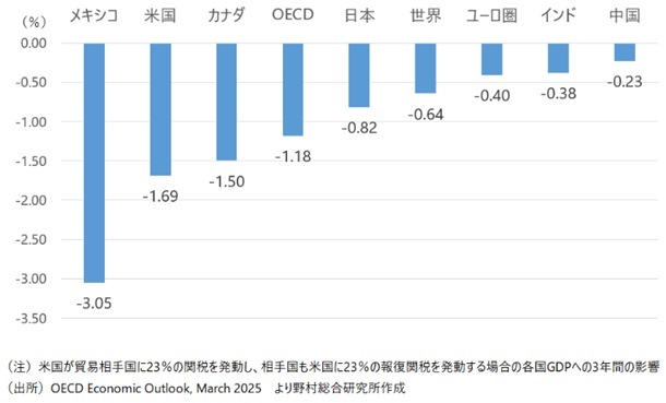 トランプ関税を引き金に、世界恐慌が起こるといった声も出ている。ただし、トランプ関税の直接的な影響だけでは、そこまで事態は悪化しないだろう。平均で23%程度と計算されるトランプ相互関税(メキシコ・カナダへの一律25%関税を含む)は、3年間の累積効果で世界のGDPを0.64%押し下げると試算される(図表)。世界経済にはかなり打撃が及ぶが、危機的な状況まで事態が悪化するとは言えない。