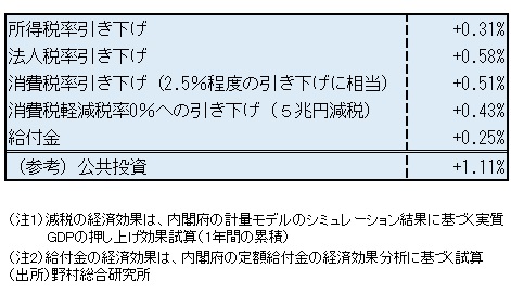 他方、同じ6兆円規模の減税を消費減税で実施する場合には、それは2.5%ポイントの消費税率引き下げに相当し、名目及び実質GDPを1年間で+0.51%程度押し上げると試算される。これは総額の給付金と比べて倍程度の経済効果となる。