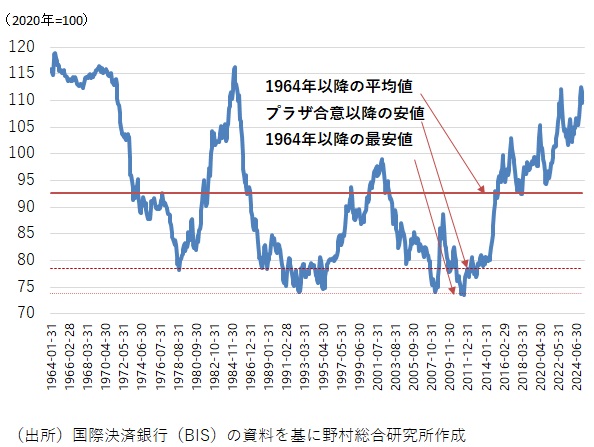 第2は、人為的なドル安誘導策の影響でひとたびドル安に弾みがつくと、過去の平均水準あたりでドル安の流れは終わらず、プラザ合意直前の水準からプラザ合意後のドルの安値(1988年12月の78.5)まで下落したのと同じ幅で実質実効ドル指数が下落することを想定したケースだ。この場合、ドル指数の下落幅は28.4%となり、ドル円レートは1ドル101.7まで円高が進む計算となる。