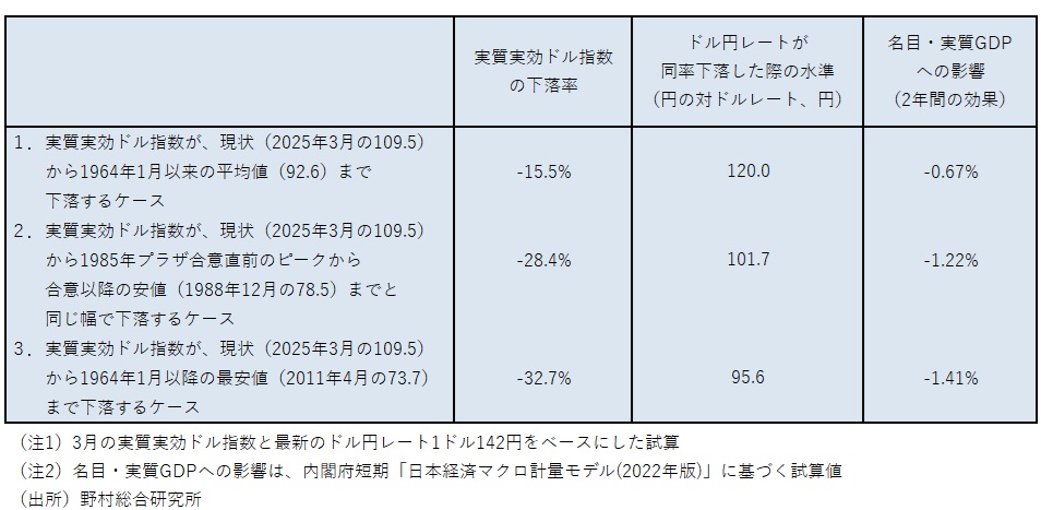 第1は、実質実効ドル指数が、現状の水準(2025年3月の109.5)から、1964年1月以降の、約60年間の実質実効ドル指数の平均値(92.6)、いわゆる均衡水準まで下落するケースだ。この場合、ドル指数の下落率は15.5%となり、さらにドル円レートが同じ下落率になると仮定すると、ドル円レートは1ドル120円ちょうどまで円高が進む計算となる(図表2)。