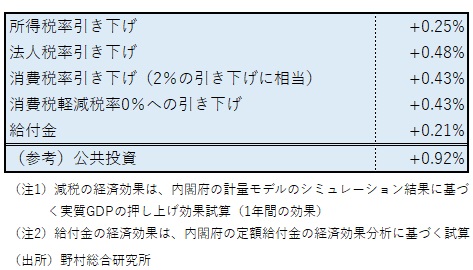 食料品などに適用される8%の軽減税率をゼロにすることは、政府によると5兆円程度の税収減となる。これは、消費税率全体を2%引き下げるのと同程度の減税措置となり、ともに名目及び実質GDPを1年間で0.43%程度押し上げる計算となる(図表)。