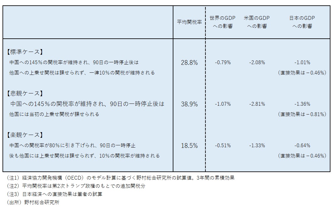 現在の25%の自動車・自動車部品、25%の鉄鋼・アルミニウムの分野別関税と10%の一律関税は、日本のGDPを直接0.46%押し下げると試算される【標準シナリオ】。90日間の一時停止後に24%の上乗せの相互関税率が課される場合には、関税全体の効果で日本のGDPを直接0.81%押し下げると試算される【悲観シナリオ】。