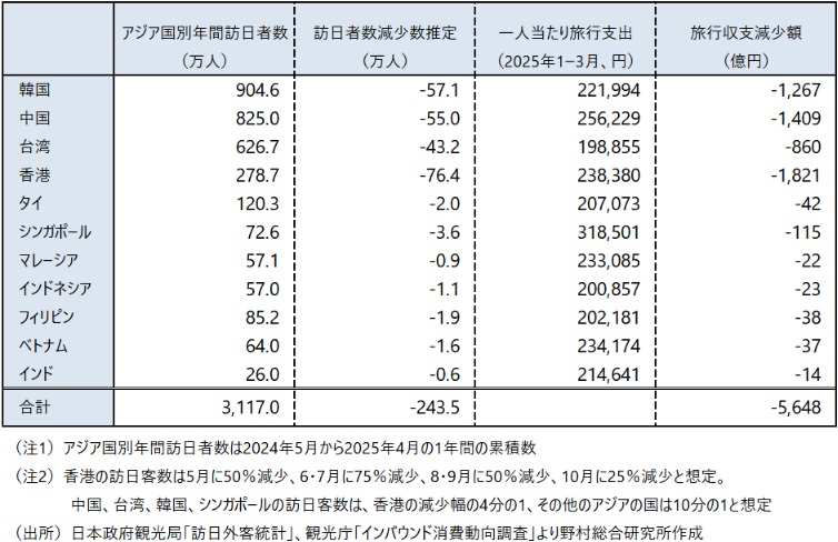 このような想定の下で試算すると、アジアからの年間訪日者数の3,100万人程度の約8%に相当する240万人程度が、5月から10月の間の半年間に日本への旅行を見合わせ、それは、インバウンド需要を約5,600億円程度減少させる(図表2)。