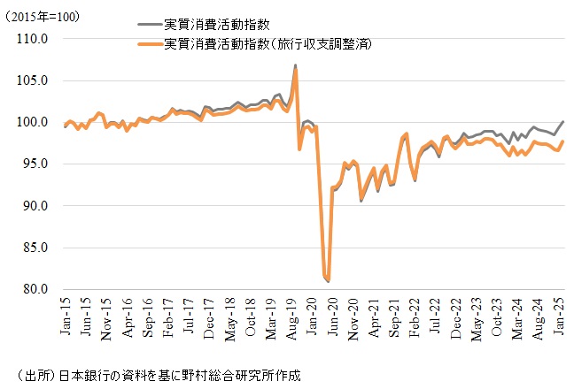 コメの価格高騰の影響などから、国内の個人消費は低迷した状況にある。1-3月期の実質個人消費は前期比0.0%と、2024年10-12月期の同+0.1%から低迷が続いた。そうした中、GDP統計では輸出に計上されるが、堅調なインバウンド需要が、観光業、小売業などを支えている(図表1)。
