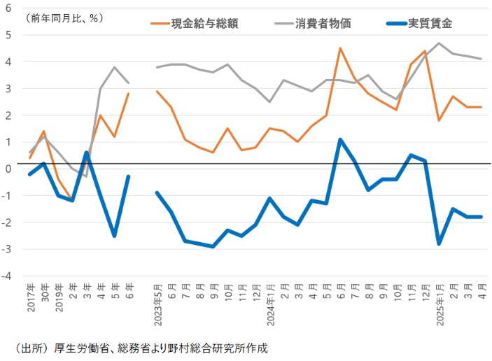厚生労働省が5日に発表した4月分毎月勤労統計で、現金給与総額は前年同月比+2.3%、実質賃金上昇率(持ち家の帰属家賃を除く消費者物価指数・総合で実質化)は同-1.8%となった。実質賃金の前年同月比での下落は4か月連続で、物価上昇に賃金上昇が追い付かず、家計が圧迫される状況が続いている(図表)。