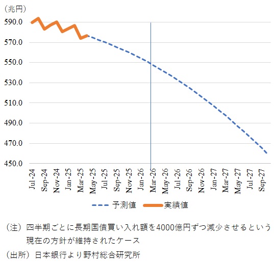 しかし、注意しなければならないのは、四半期ごとに4,000億円減額するという現状の方針の下では、月間買い入れ額は着実に減少を続け、その結果、国債保有残高は加速的に減少するという点だ(図表)。