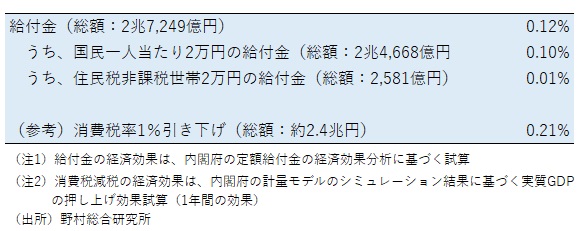 この給付金は、実質GDPを1年間で0.12%押し上げる計算となる(図表)。ちなみにこの給付金の規模は消費税率の1%引き下げ分に概ね相当するが、それは実質GDPを1年間で0.12%押し上げる。同じお金を使っても消費税減税の効果の半分程度しかない、という点を野党は指摘するだろう。