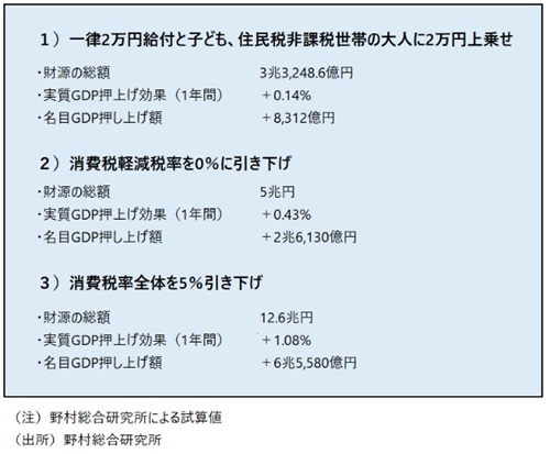 経済効果(1年間の実質GDP押し上げ効果)を試算すると、給付金よりも消費減税の方が大きくなるが、それゆえに給付金よりも消費減税の方が物価高対策として望ましいとは言えない(図表)。そもそも、現在必要とされる物価高対策とは、景気浮揚を目指した景気対策ではなく、物価高で生活が圧迫された生活弱者を支援する社会政策であるからだ。