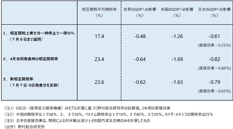 関税全体の日本のGDPへの直接的な影響は-0.85%、25%の新相互関税率が日本のGDPに直接与える影響は-0.63%と試算される。