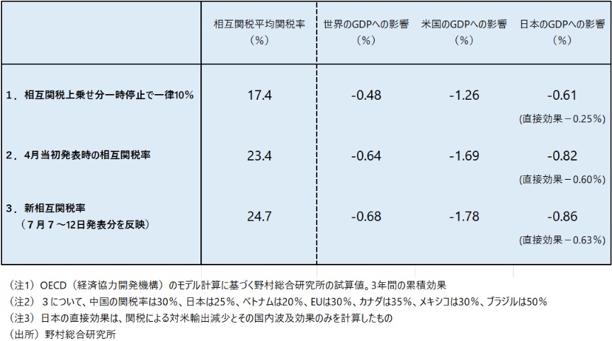 このように、関税率の引き上げが進む中、世界経済への下方リスクは高まる方向にあり、新相互関税率のもとで世界のGDPは0.68%押し下げられる計算となる(図表)。