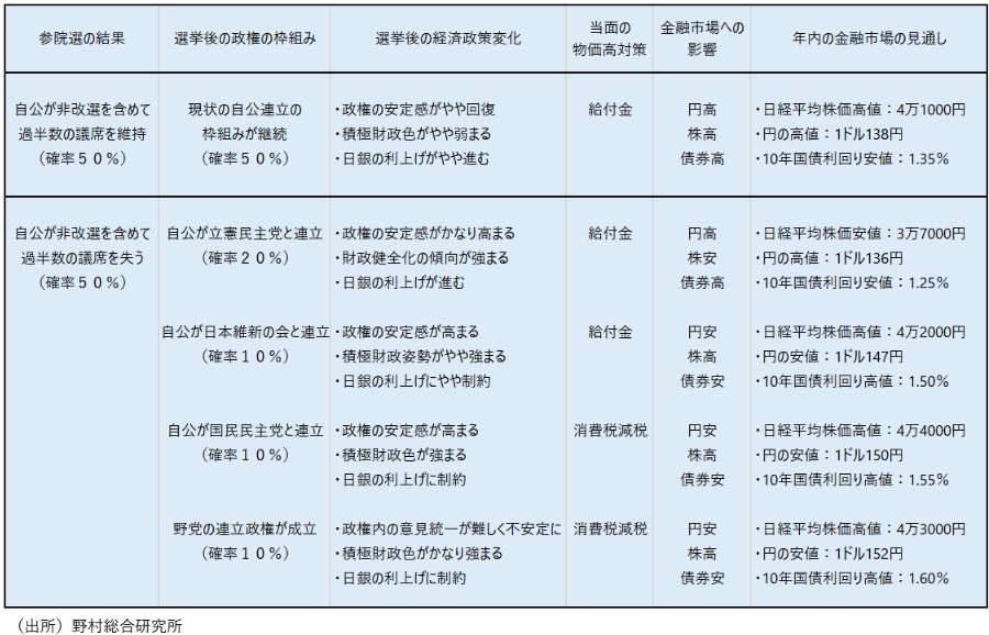 このように、与党が参院の過半数の議席を維持するか失うかだけでなく、選挙後の連立の組み換えや首相交代の有無によっても、その後の政府の経済政策は大きく異なってくる。この点から見ても、金融市場が事前に選挙結果を織り込んで、一方向に動くのは難しいだろう。その分、選挙後の金融市場のボラティリティは非常に高くなる可能性を覚悟しておく必要があるのではないか。