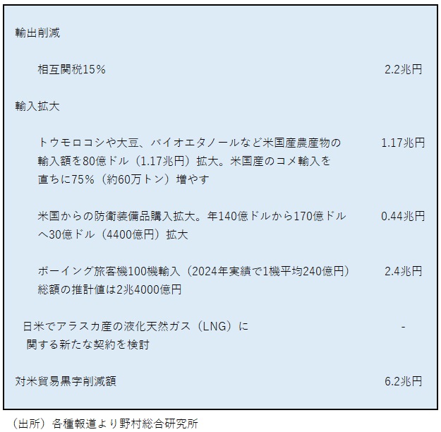 以上を合計すると、今回の合意は対米貿易黒字を6.2兆円削減し、2024年の対米貿易黒字額の8.6兆円の約7割を減少させる計算となる。それでもなお、貿易黒字の解消には至らない。