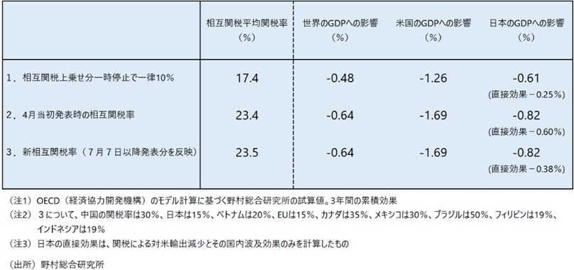 現時点で相互関税が世界のGDPに与える影響は-0.64%程度と試算される。また、7月22日(米国時間)に日米で合意した内容に基づくと、トランプ関税全体が日本経済に与える影響は1年程度で-0.55%と試算される。このうち、新たな相互関税15%の直接的な影響は-0.38%である。