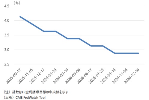 FF金利先物から、金融市場が予想する先行きの政策金利(FF金利の誘導目標)水準の確率を割り出した指標である「Fedウォッチ」によると、今回のFOMC後には、FOMC参加者が示したように、年内残り2回のFOMCで、0.25%ずつの利下げが実施されることが予想されている。さらに1年後の来年9月のFOMC時点では、2.75%~3.0%程度、つまり2%台までFF金利の誘導目標が引き下げられる可能性が織り込まれている(図表)。