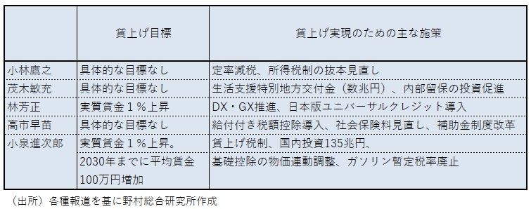 各氏とも賃上げの重要性を訴えているが、それを実現するための施策について、その効果を十分には説明ができていない。小泉氏は、賃上げを促す施策として賃上げ税制の拡充を訴えるが、既存の賃上げ税制では中小・零細企業に多い赤字企業は活用できない、と高市氏は批判する。高市氏は、推奨メニュー付き地方交付税交付金を提唱しているが、その中に中小企業向け補助金を含め、中小企業の賃上げを側面から支援する考えだ。また高市氏は、人手を確保するために収益を減らして無理な賃上げを進める「防衛的賃上げ」の問題を指摘し、企業に賃上げを促すだけでは持続的な賃上げにつながらない、との考えを示唆している。