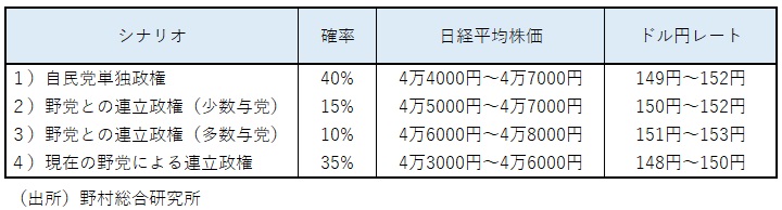 自民党単独政権となる場合には、それ以上に高市カラーの発揮は難しく、公明党が連立を離脱した分、自民党の政権運営はより困難さを増す。その場合、株価は高市総裁誕生前の4万4000円まで下落する可能性がある。野党との連立政権が成立しても、少数与党の状況が変わらないケースでは、株価の落ち着きどころはこの2つのケースの中間となり、レンジは4万5000円~4万7000円とみたい。
