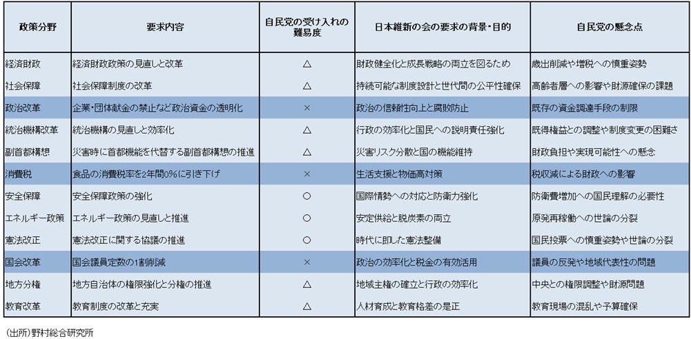 16日に日本維新の会は、連立政権入りの条件として12項目の要求を自民党に示した。他の野党との間であれば連立の大きな障害となりかねない安全保障政策、エネルギー政策、憲法改正の3分野では両党間の政策姿勢の違いは大きくなく、自民党は日本維新の会の要求を概ね受け入れるとみられる。