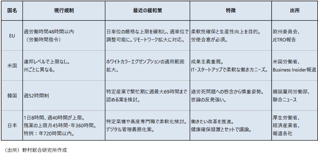 重要なのは、労働者の健康維持に十分配慮しつつ、個々の事情や意向に合わせて、労働時間をより柔軟化していくことは検討していくべきではないか。欧州連合(EU)や韓国などでも、労働時間規制の柔軟化が検討されているが、そうした海外の事情や海外での議論も参考にする必要があるだろう(図表)。