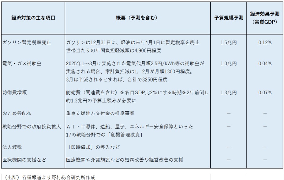 昨年の石破政権下での経済対策は、「真水」にあたる国の一般会計13.9兆円、事業規模39.0兆円であったが、今回の経済対策は「真水」で20兆円を超えるなど、規模が大幅に拡大する可能性がある。