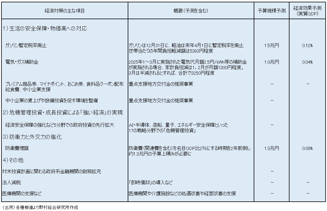 経済対策は、1)生活の安全保障・物価高への対応、2)危機管理投資・成長投資による「強い経済」の実現、3)防衛力と外交力の強化の3本柱で構成される。