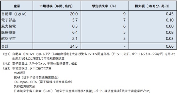 2012年の尖閣問題の際に公表された、経済産業省「レアアース供給制約影響調査」(2010年10月)及び業界団体報告(日本自動車工業会・電子情報技術産業協会)に基づいて、当時の分野ごとの生産減少率(想定損失率)を推定した。これを各分野の市場規模の推定値に当てはめて生産減少額を試算したものが下に示した図表である。