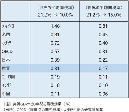 世界の実質GDPへの影響は、新関税10%で+0.31%、15%で+0.17%