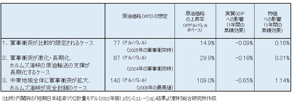 図表 イラン情勢の緊迫化と原油価格上昇の日本経済への影響のシナリオ別試算