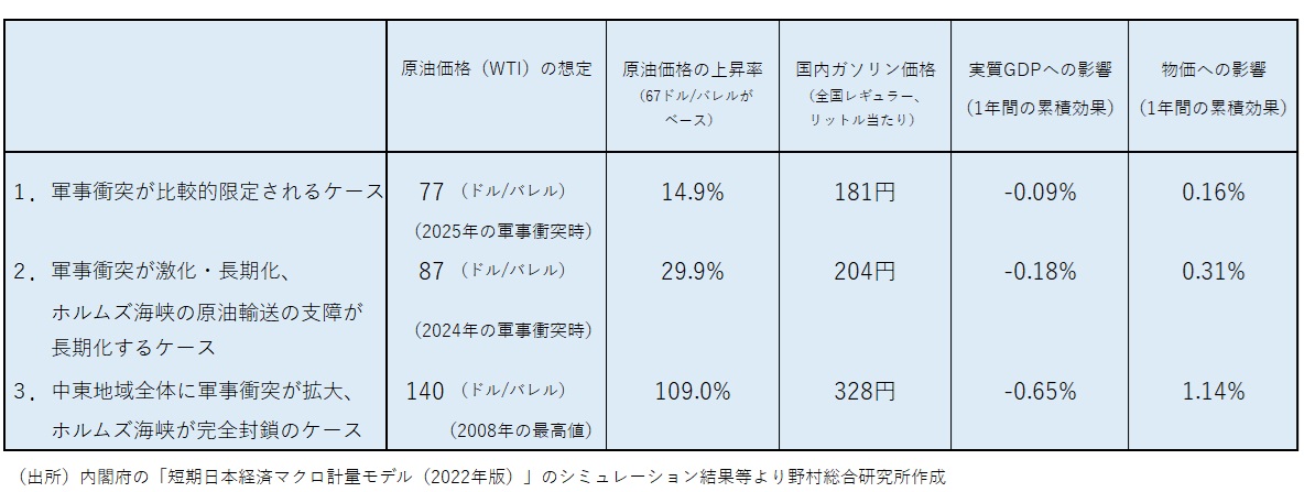 図表1 イラン情勢の緊迫化と原油価格上昇の日本経済への影響のシナリオ別試算