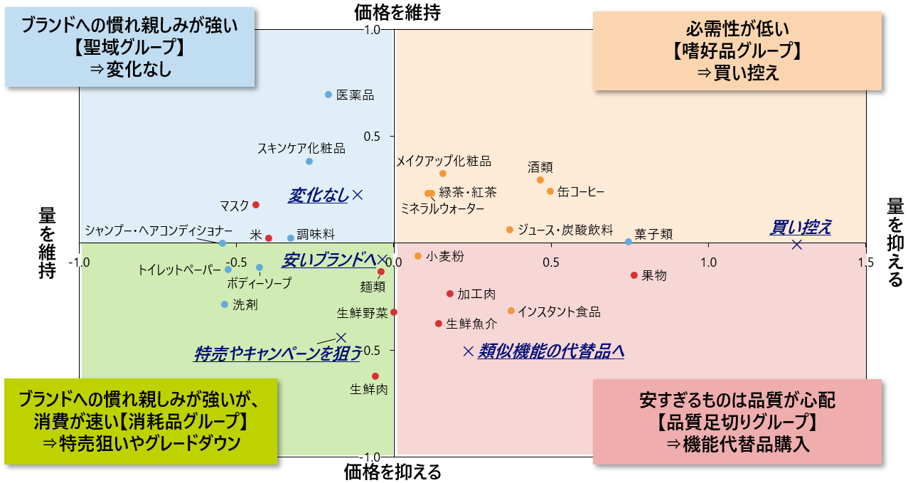 注)商品と購買行動の変化の関係をコレスポンデンス分析で表現。各象限のグループ名は、各カテゴリの普段の買い物における考え方や行動からNRIが付与。