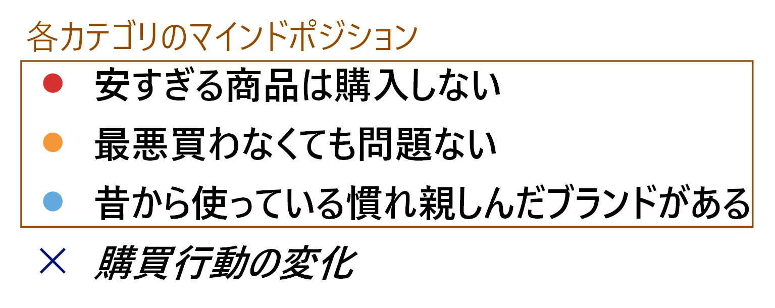 買い物における消費者の考え方や行動は、商品のカテゴリによって異なります。それを私たちは「マインドポジション」と呼んでいます。1つめはブランドへの慣れ親しみが強い「聖域グループ」(医薬品やスキンケア化粧品など)で、価格高騰下においても購買行動が変化しにくいです。2つめはブランドへの慣れ親しみが強いものの消費スピードが速い「消耗品グループ」(トイレットペーパーや洗剤など)で、価格が高騰すると特売やキャンペーンのタイミングを狙って買われたり、より安価なブランドの商品が選ばれたりする傾向があります。3つめは「嗜好品グループ」(菓子や飲料など)で、「最悪買わなくてもいい」とみなされ、価格高騰下で最も買い控えが起きやすいグループです。4つめの「品質足切りグループ」(生鮮品や加工肉など)は安すぎると品質が不安視されることから、価格高騰下では類似機能を持つ代替品が買われるようになります( 【データ1】 )。このように、商品のカテゴリによって購買行動の変化に違いがあることがわかります。