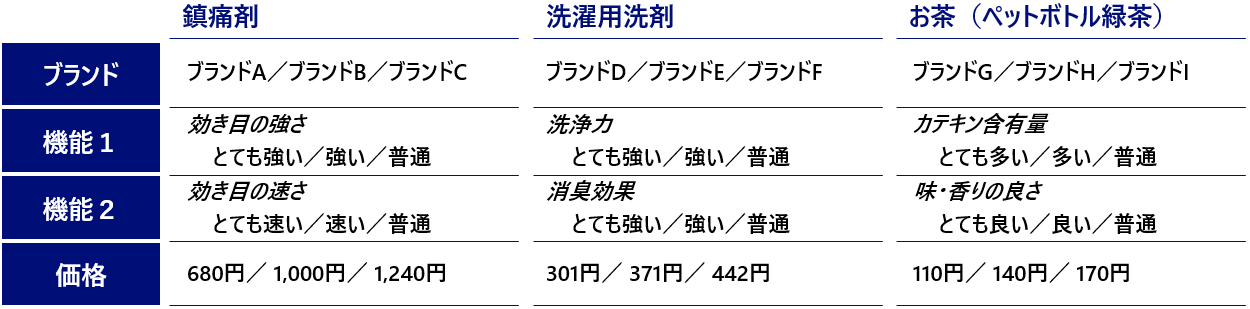 コンジョイント分析とは「ブランド」「機能」「価格」などの商品属性が、購入の意思決定にどのくらい寄与しているかを測る方法です。今回は、 【データ2】 の内容で、「鎮痛剤」「洗濯用洗剤」「お茶(ペットボトル緑茶)」について商品属性を組み合わせた仮想的な商品を並べて、各商品を何番目に買いたいかをアンケートで聴取しました。その結果から、各属性のレベルに応じた魅力度や購入意向への寄与度を算出しました。