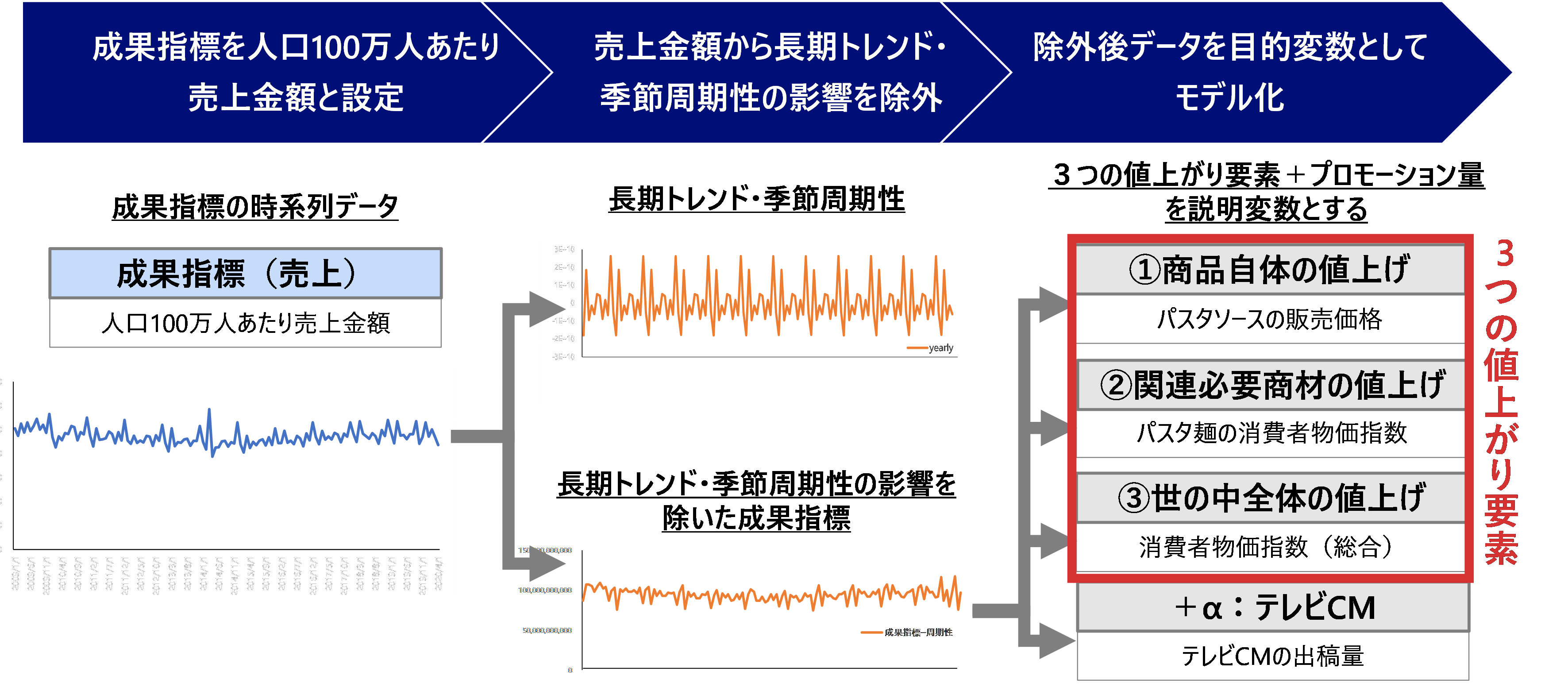 時系列の売上データから長期トレンドや季節周期性の影響を除外した上で、「商品自体の値上げ」「関連必要商材の値上げ」「世の中全体の値上げ」のうちどの値上がり要素が最も売り上げに影響しているかを分析します。