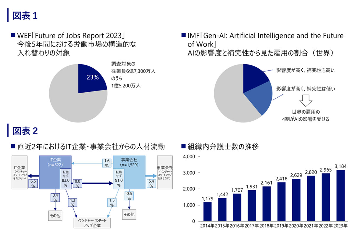 世界経済フォーラム(WEF)の「Future of Jobs Report 2023」によると、今後5年間で、調査対象のデータセットに含まれる従業員6億7,300万人の23%(1億5,200万人)が労働市場の構造的な入れ替わりの対象となり、国際通貨基金(IMF)が2024年1月に公開したブログによれば、「世界の雇用の約40%がAIに影響を受け、代替あるいは補完される見込み」としている。その要因は様々でそれぞれの雇用環境による違いもあるが、企業としては、AIの普及により、ゼネラリスト的な仕事は代替されていくことを踏まえ、事業戦略を実現する上で必要な高度な専門人材を見極め、獲得・充実していくことが今後ますます重要となるだろう(図表1)。