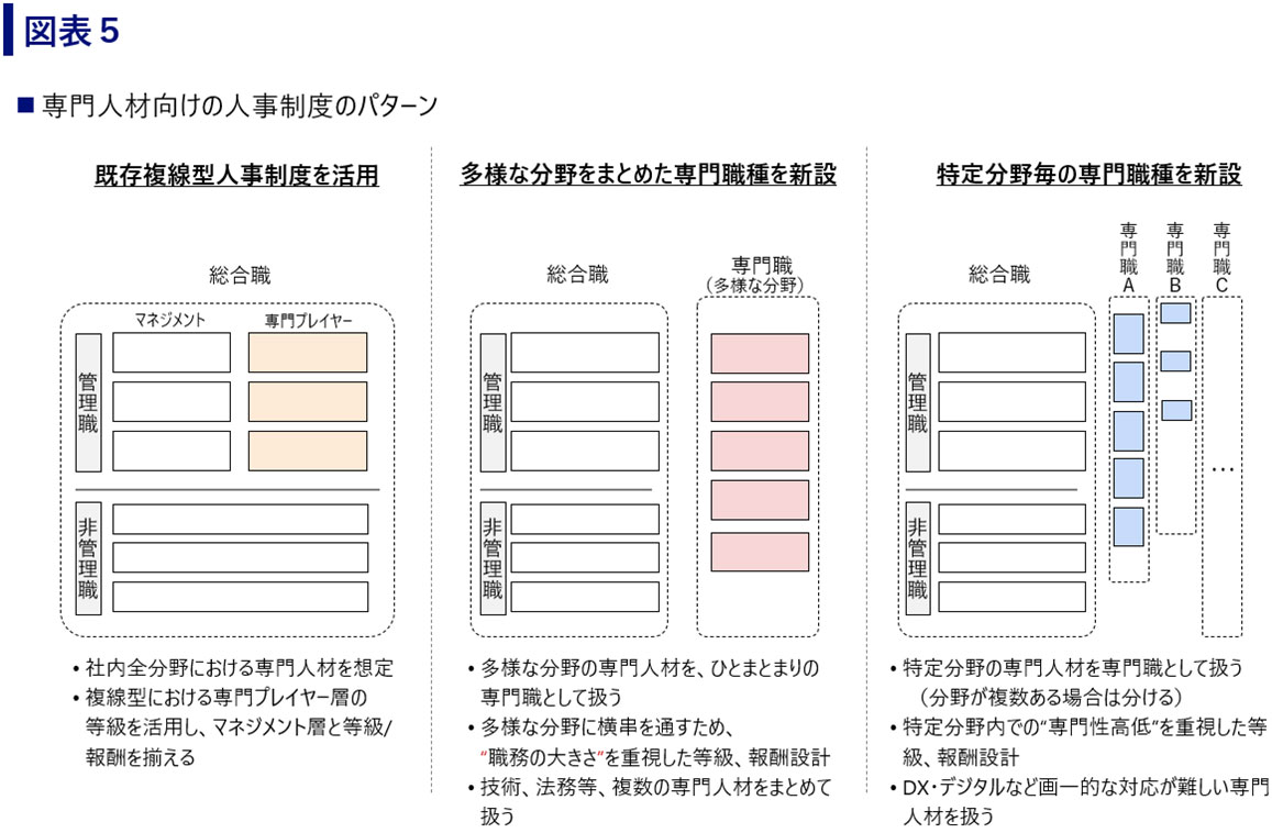「専門人材向けの新たな制度設計」においては、“多様な分野をまとめた専門職種を新設する”パターンと、一括りにする画一的な対応が難しい“特定分野毎の専門職種を新設する”パターンが考えられる(図表5)。いずれのパターンにおいても職種を新設する場合は、まず対象となる専門性領域を明確にすることが重要である。その後、対象となる専門性のレベル要件を考慮して等級要件や評価基準を策定し、市場の報酬水準と既存社員とのバランスを参考に報酬の水準や支払い方を検討していく必要があるため、人事部だけでなく専門人材が活躍する事業部門との協業で設計することが望ましい。