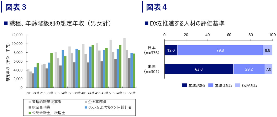 先に例を挙げたような専門人材は獲得における競争も激しく、20~30歳台の若い層であっても賃金水準が高く設定されることがある。実際に厚生労働省の賃金構造基本統計調査を見ても、「システムコンサルタント・設計者」「公認会計士、税理士」といった専門職種は若い年齢層の賃金水準が高く、年功的な賃金上昇は限定的となっている。(図表3)これまで日本企業の多くは総合職として経験や能力を積み重ねて経営幹部を目指すキャリアが主流で、賃金も併せて年功的なカーブを描いていたが、専門人材の報酬水準とは乖離が生じている。